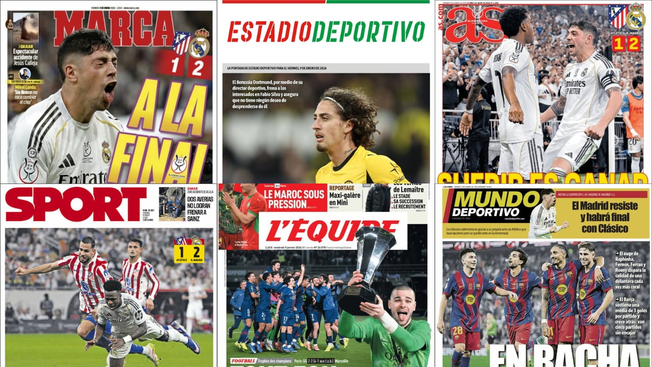 Las portadas del viernes 9 de enero se hacen eco, como es lógico, del resultado del encuentro que disputaron este pasado jueves Atlético de Madrid y Real Madrid en las semifinales de la Supercopa de España. Los de Xabi Alonso, tras su triunfo por 1-2, han posibilitado el tercer Clásico consecutivo en una final de Supercopa de España que se disputará el próximo domingo.