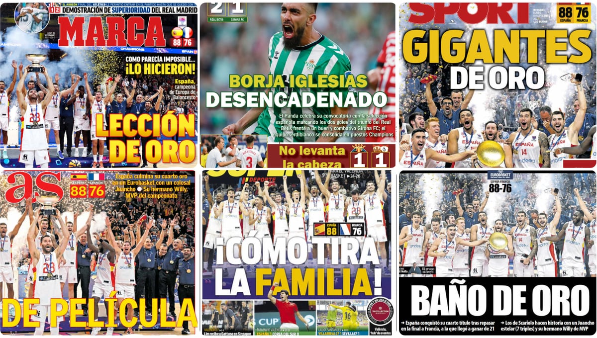 La selección española también domina la prensa generalista: 'La selección del relevo se baña en oro' (ABC), 'La España inesperada' (El Mundo), 'España de oro' (El Periódico de España), 'El título con más mérito' (El Correo), 'España culmina su hazaña' (El País)... Todo el territorio nacional, postrado a los pies de Scariolo y sus 12 jugadores. Un equipazo.
