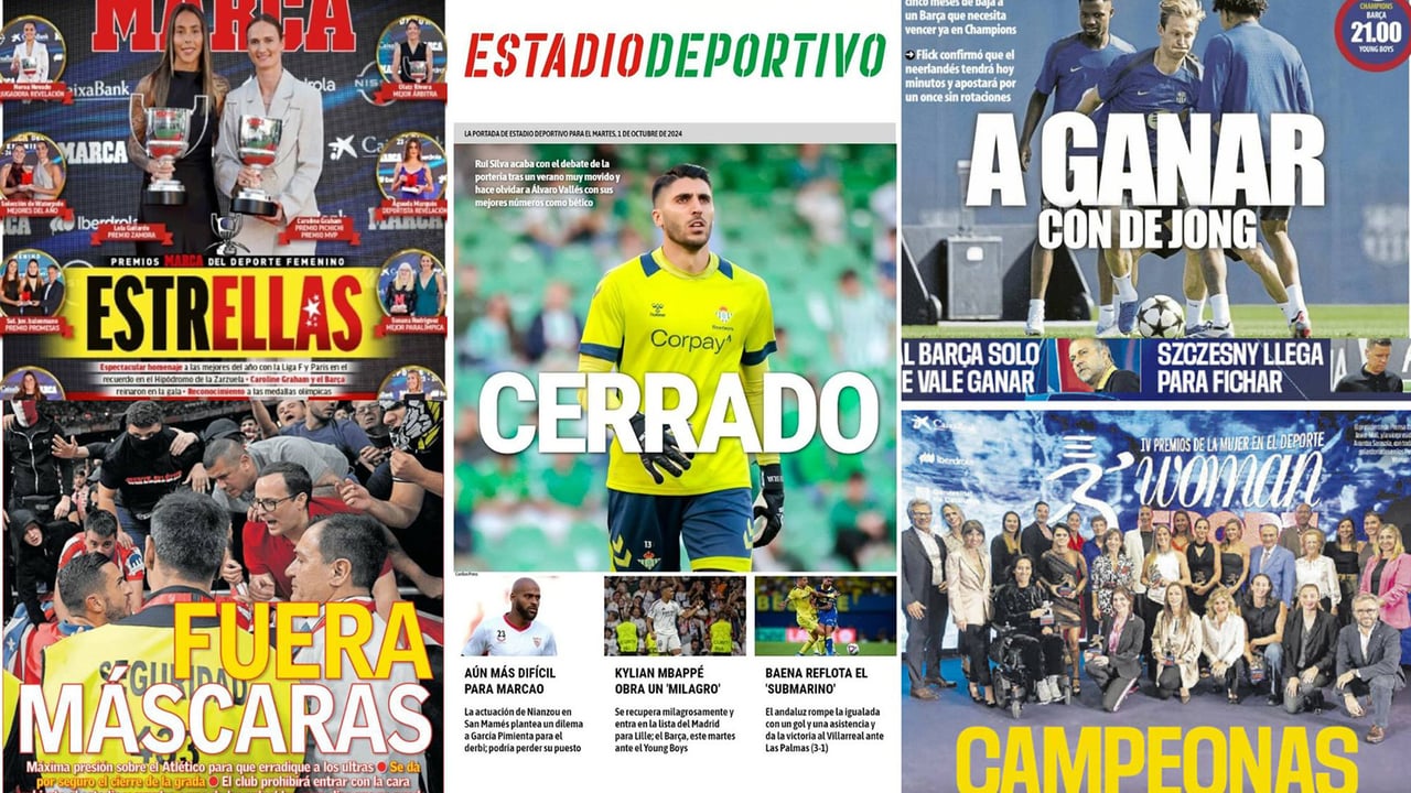 Las portadas de las principales cabeceras de la prensa deportiva nacional han apostado por temas muy dispares para arrancar el mes de octubre, con el deporte femenino como uno de los protagonistas junto a las secuelas del derbi madrileño, la cita de Champions del Barça y nombres propios en Betis y Sevilla como Rui Silva o Marcao, sorprendiendo por ejemplo que la cita azulgrana no mande en la primera página de uno de los medios catalanes.