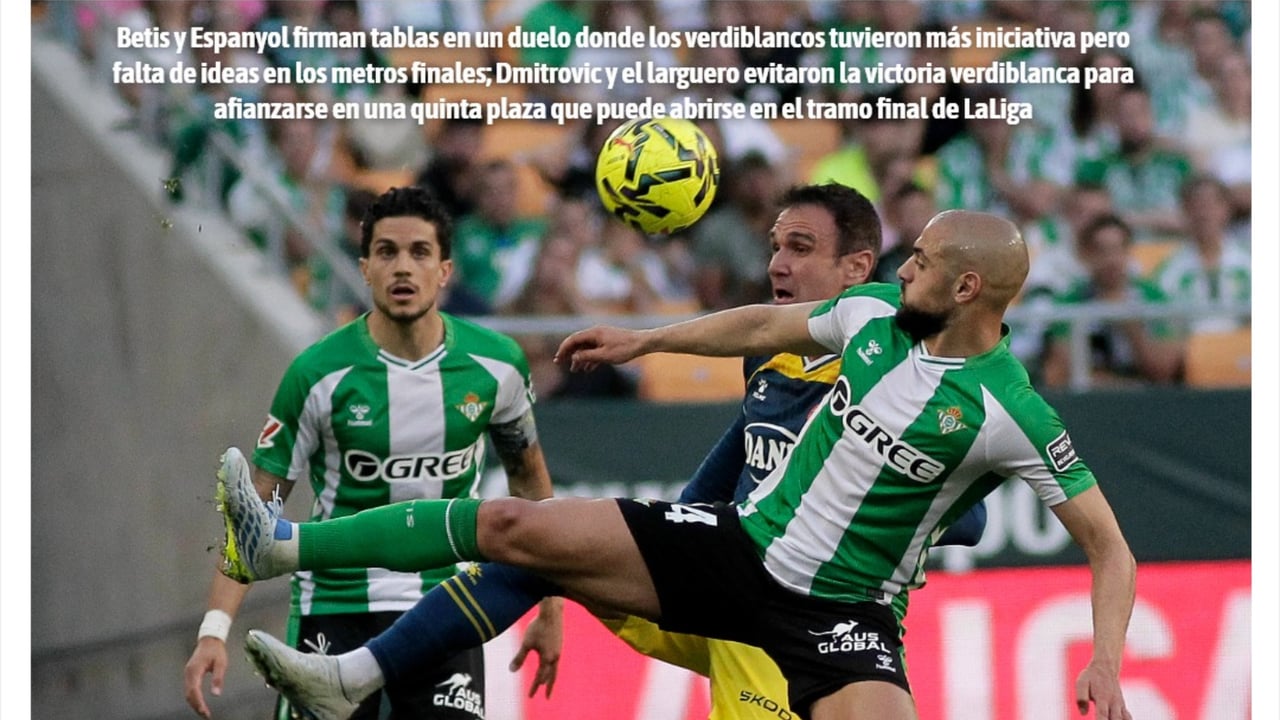 Betis y Espanyol firman tablas en un duelo donde los verdiblancos tuvieron más iniciativa pero falta de ideas en los metros finales; Dmitrovic y el larguero evitaron la victoria verdiblanca para afianzarse en una quinta plaza que puede abrirse en el tramo final de LaLiga.