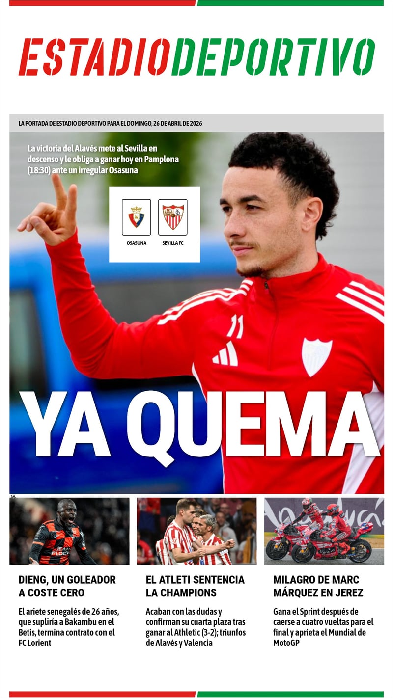 La portada de ESTADIO Deportivo para el domingo 26 de abril de 2026