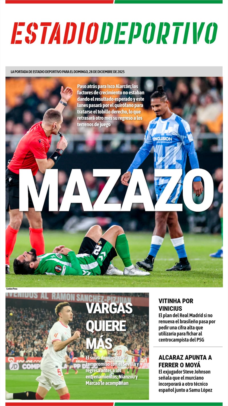 La portada de ESTADIO Deportivo para el domingo 28 de diciembre de 2025