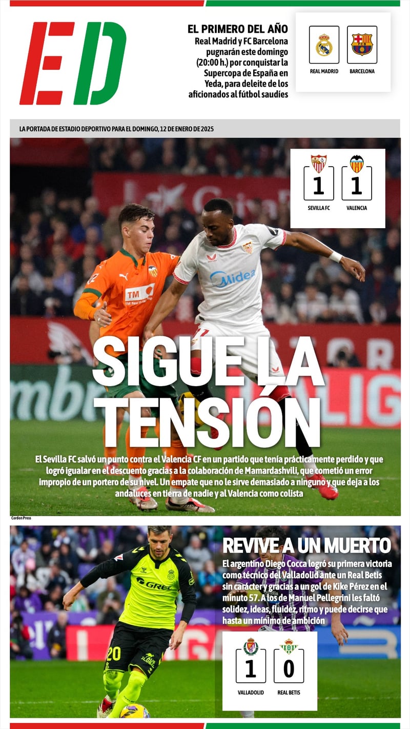El empate del Sevilla ante el Valencia, la derrota del Betis en Valladolid y la previa de la final de la Supercopa, protagonistas de la portada de ESTADIO Deportivo