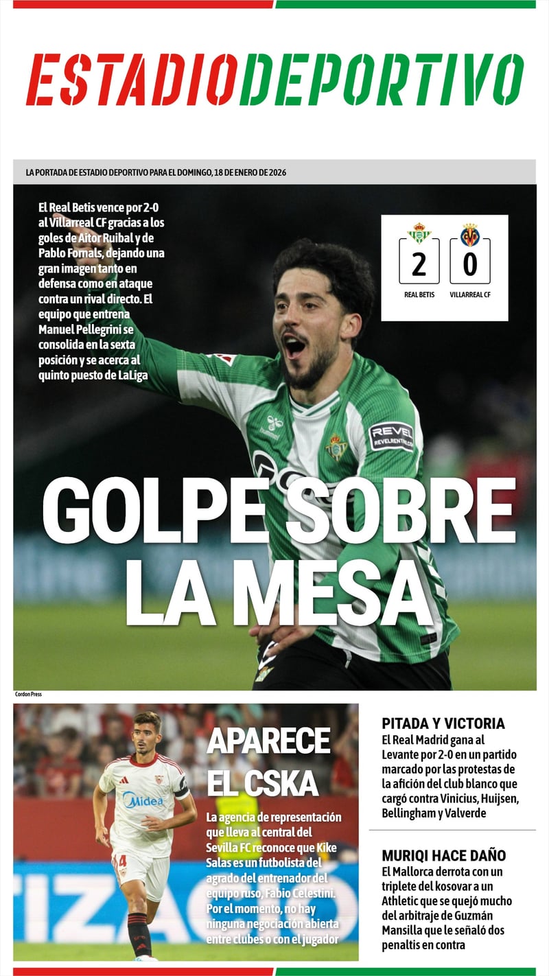 La portada de ESTADIO Deportivo para este domingo 18 de enero de 2026.Cordon Press
