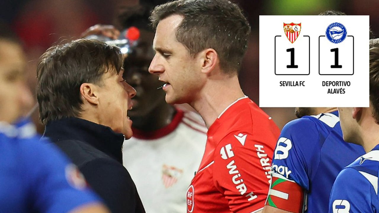 El Sevilla logra sumar un punto ante un rival directo en un partido con mucha polémica y condicionado por la expulsión de Juanlu al cuarto de hora; el equipo se repuso con gol de Sow y, tras el empate alavesista, supo resistir en pleno caos con rojas a Almeyda y Jordán