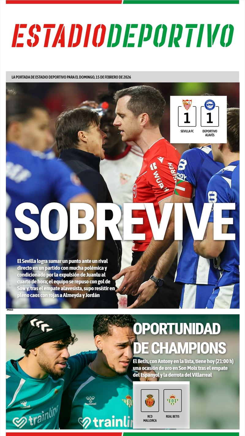 El empate del Sevilla contra el Alavés en un partido cargado de polémica abre la portada de ESTADIO de este domingo 15 de febrero, con espacio también para la previa de la importante visita del Betis a Mallorca