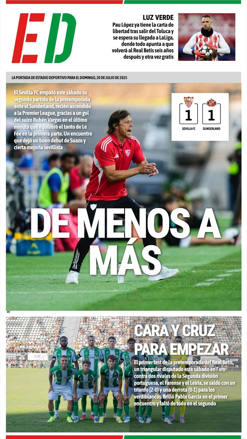El triangular del Betis en Faro y el empate del Sevilla ante el Sunderland, protagonistas de la portada de ESTADIO Deportivo