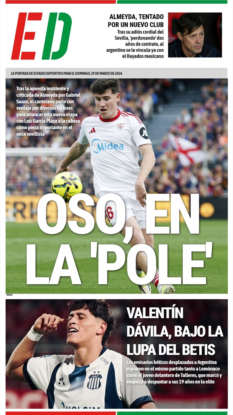 La portada de ESTADIO Deportivo para este domingo 29 de marzo abre con las opciones de Oso de ser importante con García Plaza y recoge también el posible nuevo equipo de Almeyda y el seguimiento 'in situ' del Betis a Valentín Dávila
