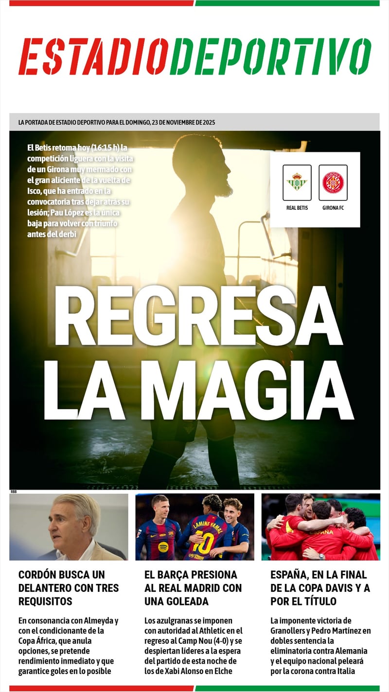 El partido del Betis contra el Girona, con el gran aliciente del regreso de Isco, abre la portada de ESTADIO Deportivo de este domingo, donde hay cabida también para el mercado de enero sevillista, el triunfo del Barça y el éxito de España en la Copa Davis