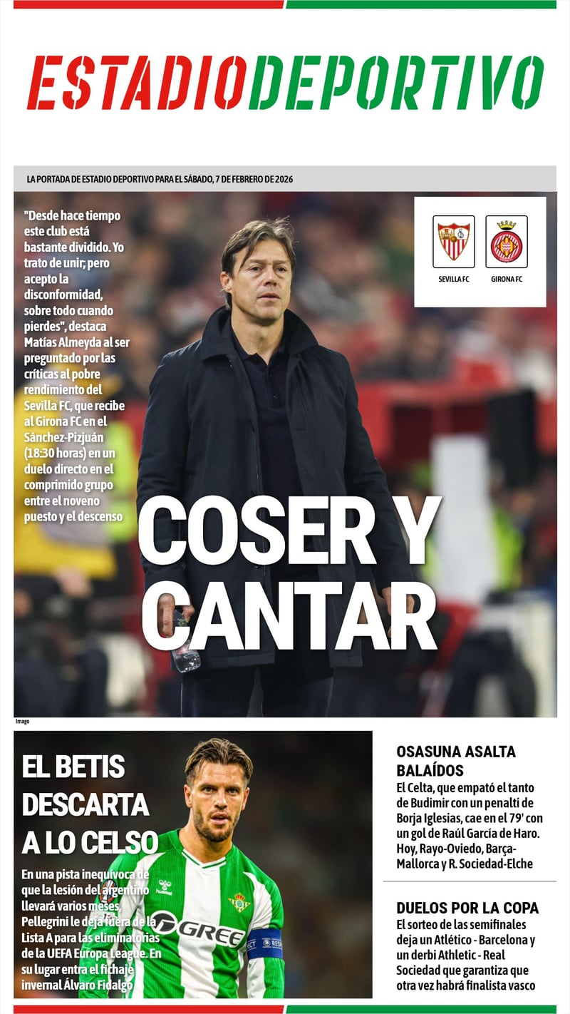 La portada de ESTADIO Deportivo para este sábado, 7 de febrero de 2026 tiene como tema de apertura el duelo directo en esa apretada zona media de LaLiga EA Sports que disputarán el Sevilla FC y el Girona FC en el Estadio Ramón Sánchez-Pizjuán; en una nueva jornada en la que Andalucía vuelve a mirar hacia el cielo pidiendo clemencia ante la entrada de la Borrasca Marta, que amenaza con agravar los devastadores daños provocados por Leonardo.