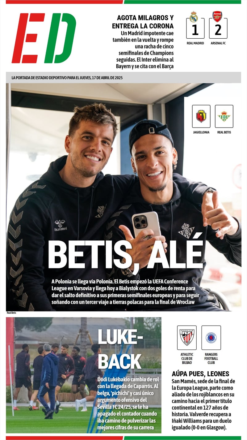 La portada de ESTADIO Deportivo para este Jueves Santo, día 17 de abril de 2025, viene marcada por las crónicas de los dos últimos duelos de vuelta en los cuartos de final de la UEFA Champions League, con el Real Madrid buscando una remontada heroica que el Arsenal FC frustró por completo, y con las previas de los choques con los que el Athletic Club de Bilbao y el Real Betis buscarán las semifinales de la Europa League y la Conference League ante Rangers FC y Jagiellonia Bialystok, respectivamente. Además, en el Sevilla FC sigue acaparando focos Joaquín Caparrós, quien da vuelta al once inicial ante el Deportivo Alavés con un previsible nuevo cometido para Dodi Lukébakio.