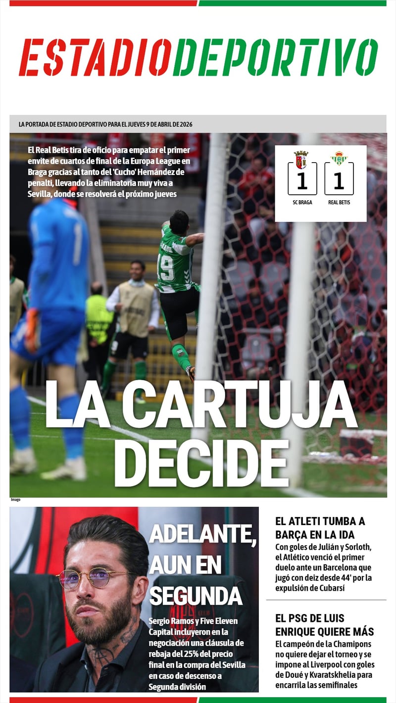 La portada de ESTADIO Deportivo para el jueves 9 de abril de 2026: