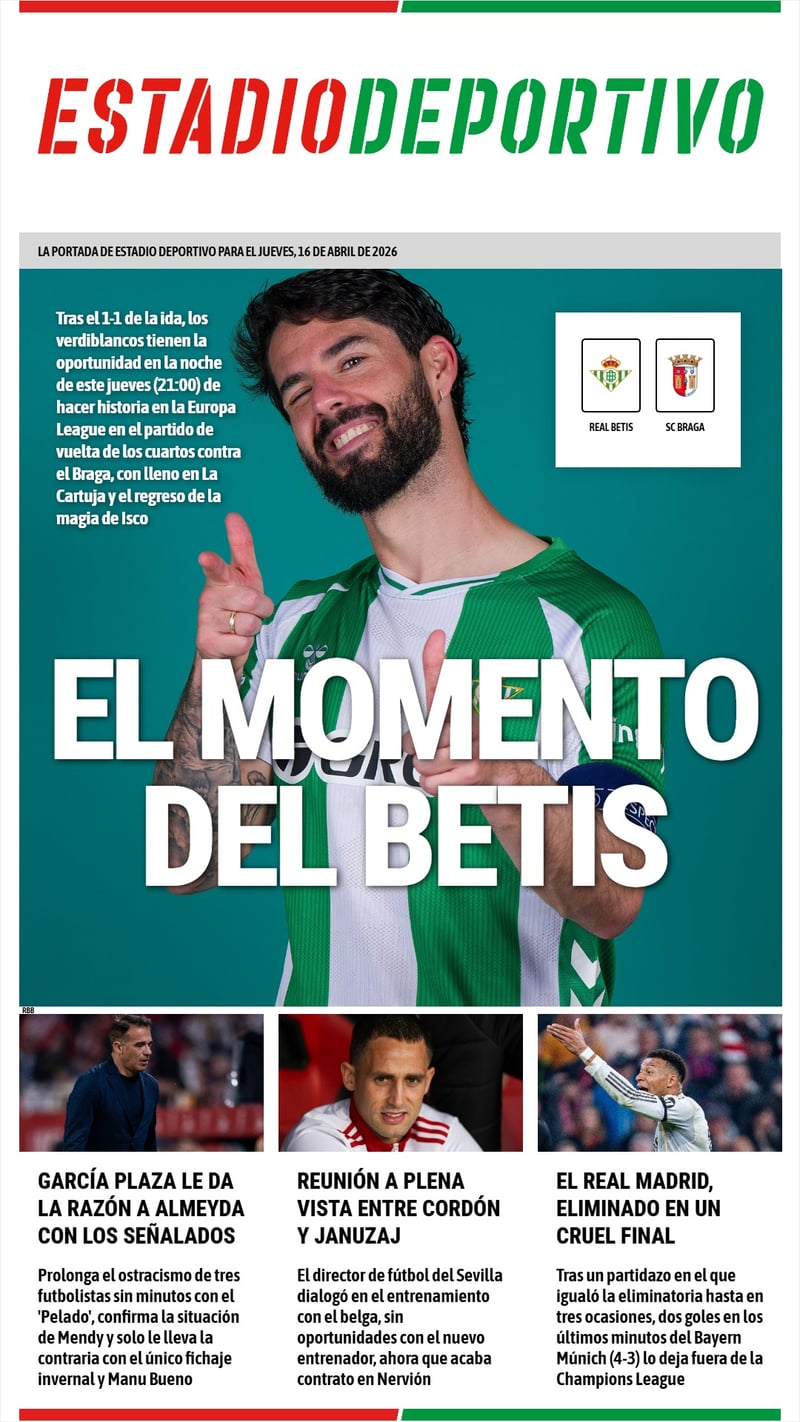La portada de ESTADIO Deportivo de este jueves abre con la oportunidad histórica del Betis en la Europa League y le dedica espacio a los 'señalados' de García Plaza, al encuentro Cordón-Januzaj y a la derrota en Champions del Real Madrid