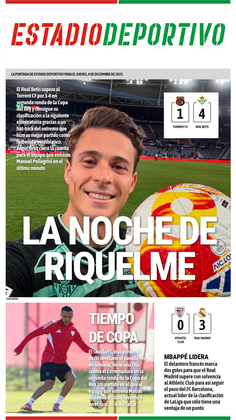 La portada de ESTADIO Deportivo para el jueves 4 de diciembre de 2025