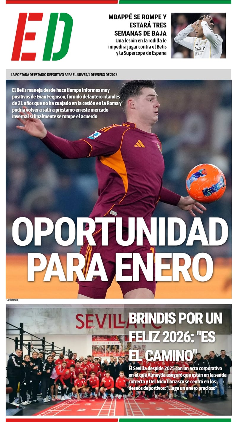 La primera portada de ESTADIO Deportivo de 2026 abre con la posibilidad de que Evan Ferguson se ponga a tiro del Betis en este mercado; también hay espacio para el brindis del Sevilla por 2026 y la lesión de Mbappé