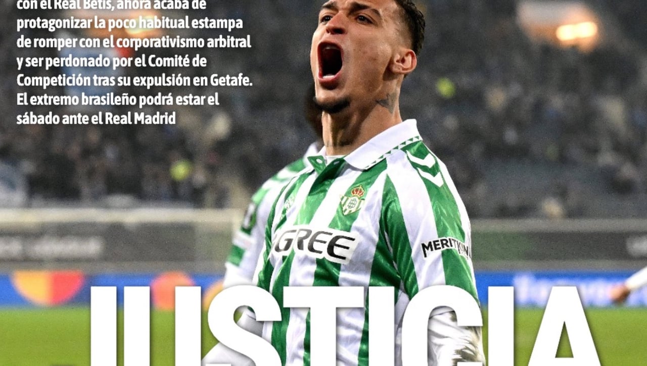 Antony sigue en racha: tras sumar tres goles, un penalti provocado y una asistencia en sus cinco primeros partidos con el Real Betis, ahora acaba de protagonizar la poco habitual estampa de romper con el corporativismo arbitral y ser perdonado por el Comité de Competición tras su expulsión en Getafe. El extremo brasileño podrá estar el sábado ante el Real Madrid.