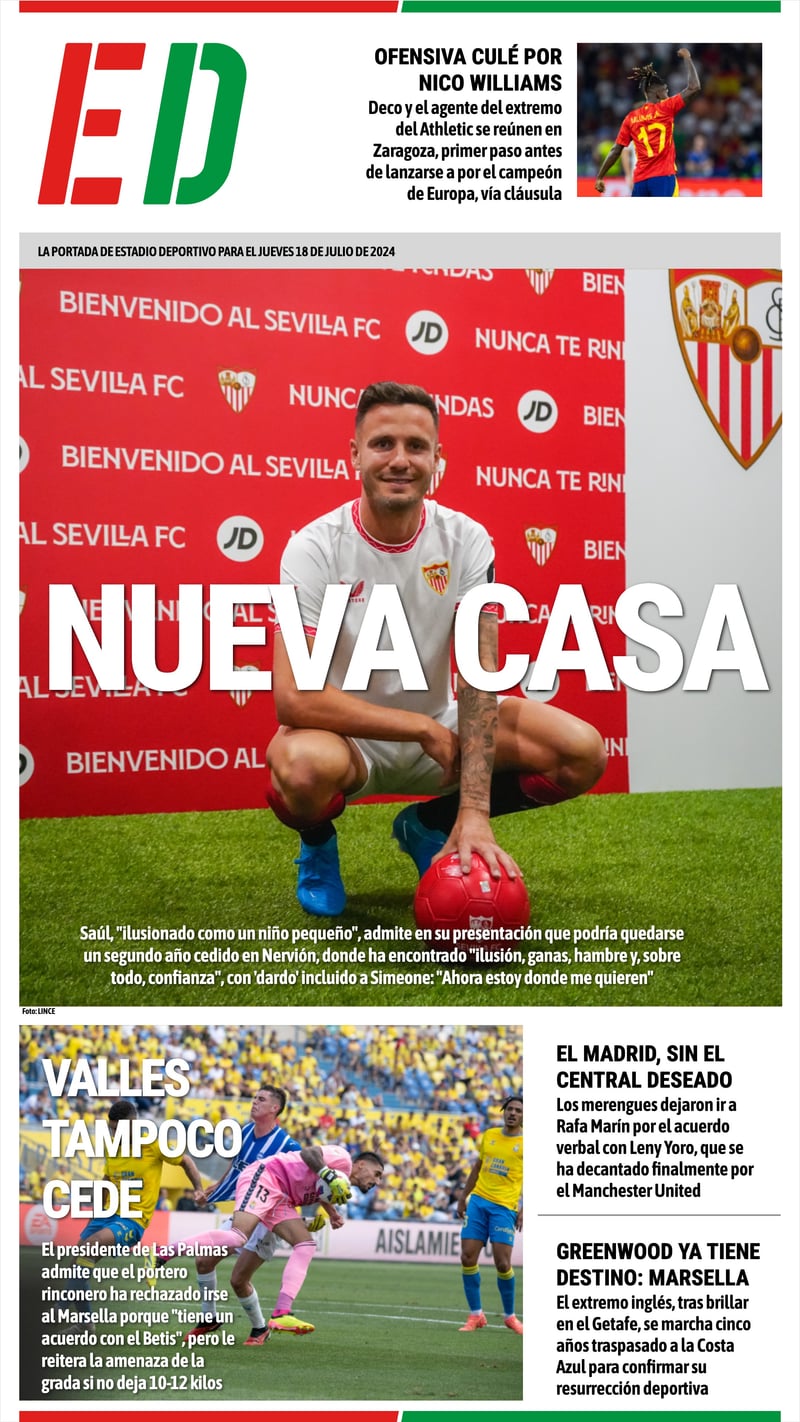 Saúl Ñíguez posa como futbolista del Sevilla y este miércoles ya se ejercitó a las órdenes de García Pimienta. - LinceLa portada de ESTADIO Deportivo para el jueves 18 de julio de 2024:
