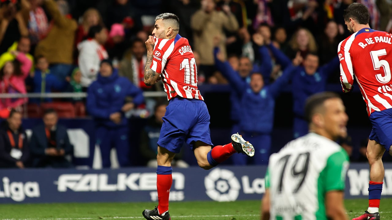 Ángel Correa se besa el escudo del Atlético para celebrar su gol ante la desesperación del bético Luiz Felipe.UES