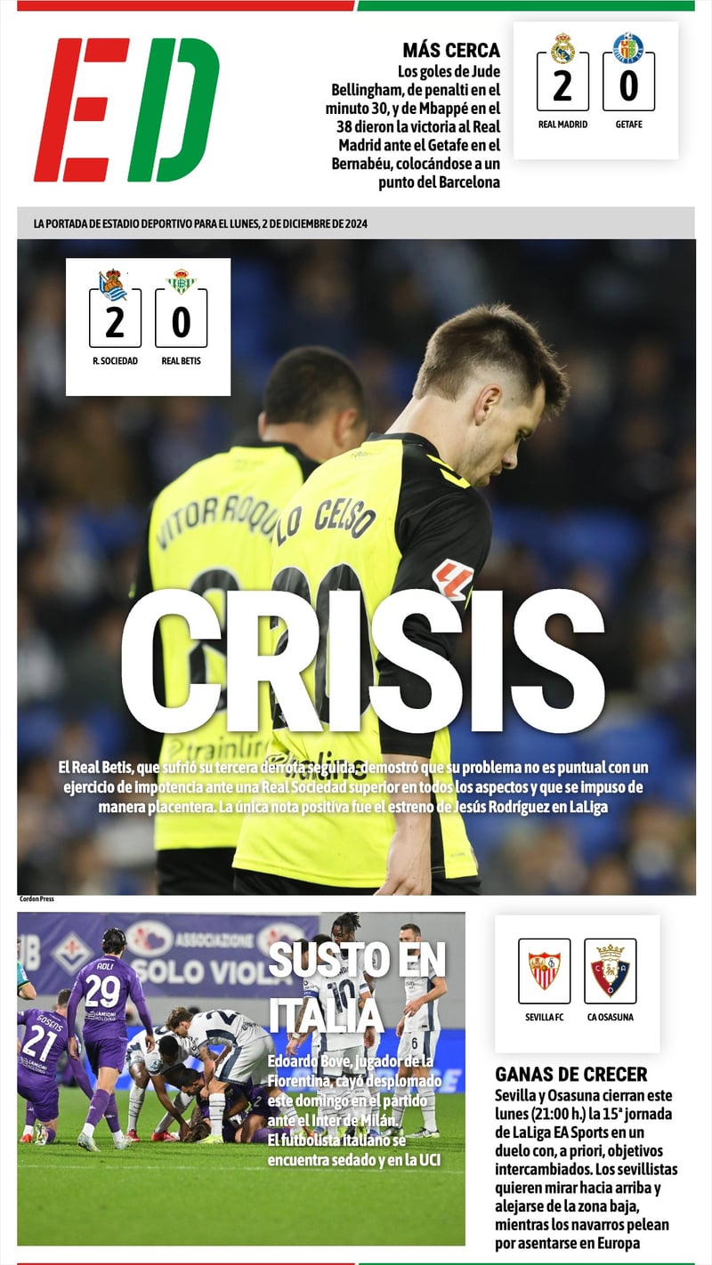 La derrota del Betis, la previa del partido del Sevilla, el triunfo del Real Madrid y el susto protagonizado por Edoardo Bove, protagonistas de la portada de ESTADIO Deportivo