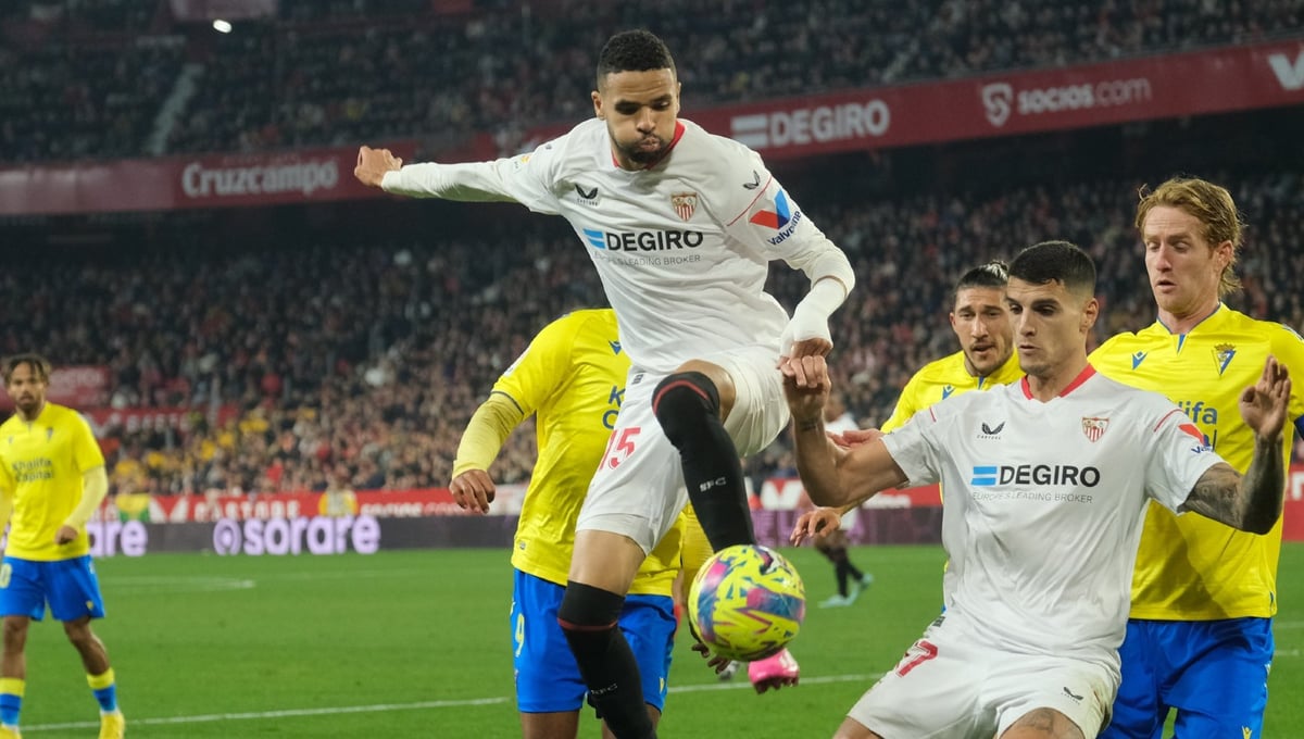 En-Nesyri trata de rematar en el Sevilla-Cádiz.@Lince Photo