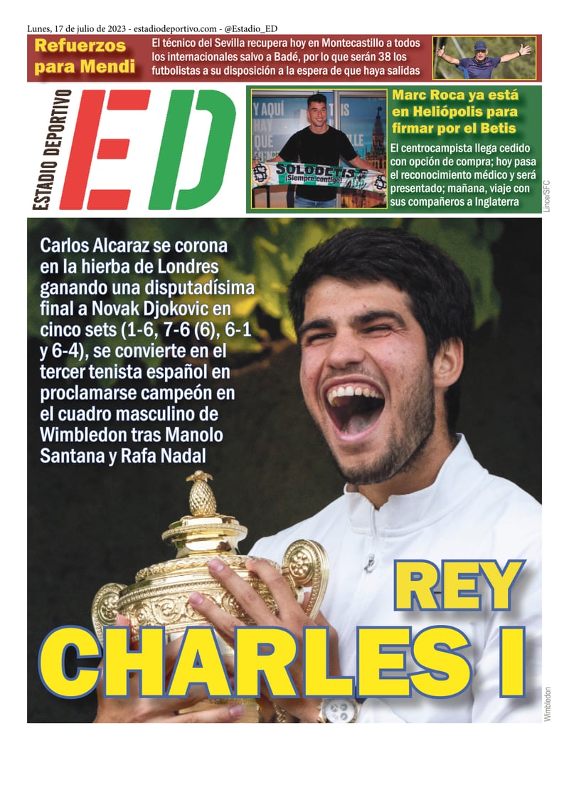Carlos Alcaraz hace historia en Wimbledon, reinando sobre la hierba de Londres tras ganar en la final a Djokovic; Marc Roca ya está en Sevilla para ser el segundo fichaje del Betis y en el Sevilla se viene 'overbooking' con los internacionales