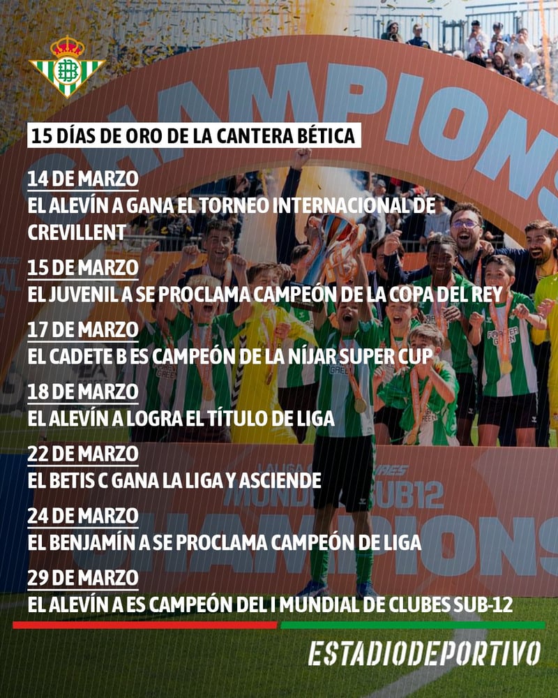 El Alevín A del Real Betis se ha proclamado el primer campeón del mundo sub 12 tras ganar el Mundial de LaLiga Futures con una brillante remontada ante el equipo brasileño del Flamengo (1-3), completando así un torneo sobresaliente que redunda en el buen trabajo de cantera que viene haciendo el club verdiblanco.