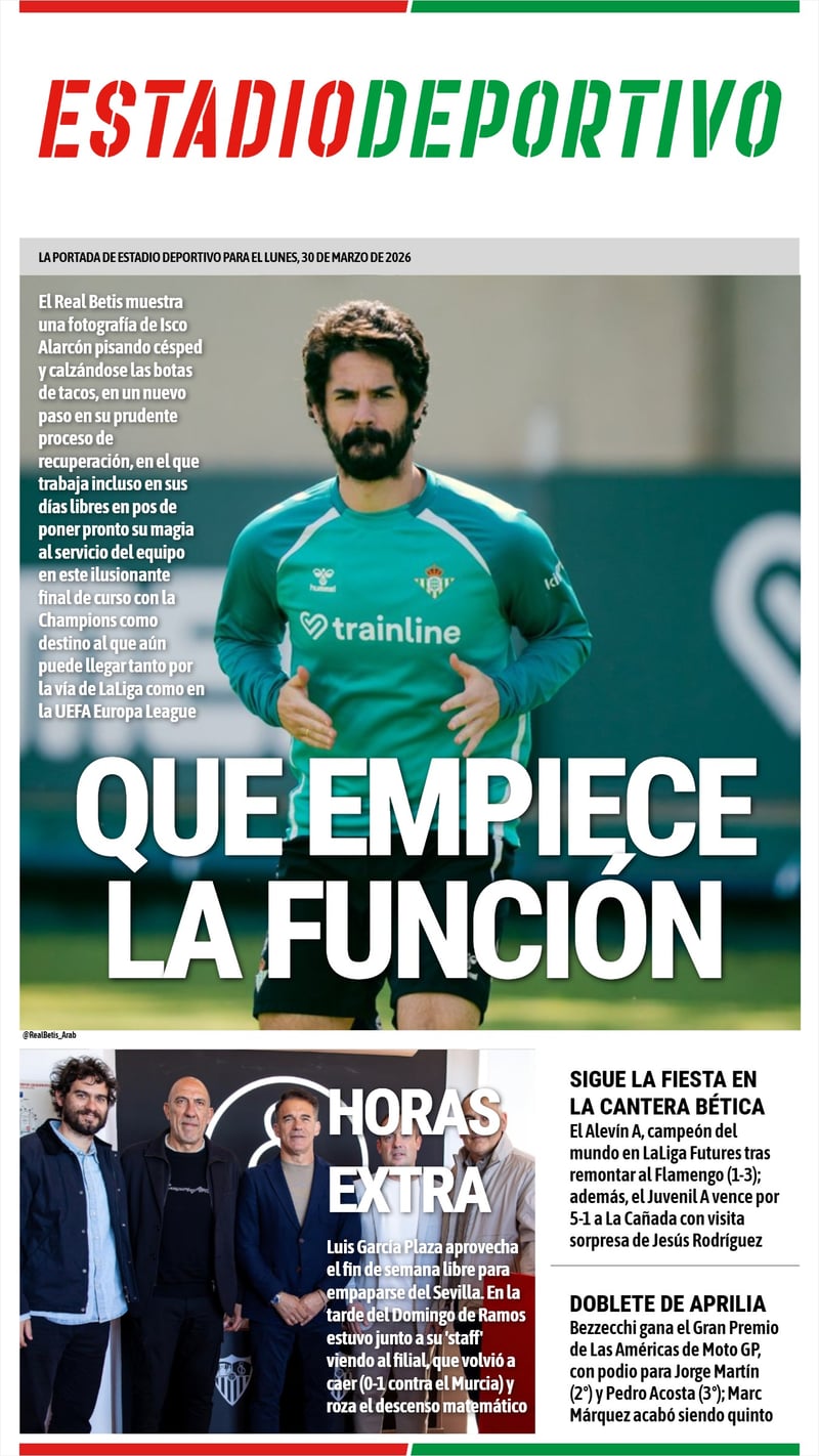 La portada de ESTADIO Deportivo para este Lunes Santo, día 30 de marzo de 2026, tiene como protagonista principal a Isco Alarcón, que sigue avanzando en su vuelta a los terrenos de juego. Además, el nuevo técnico del Sevilla FC, Luis García Plaza, echa horas extra estudiando en directo al filial nervionense y en la cantera bética alargan la fiesta a cuenta de su Alevín A, campeón del mundo sub 12. Fuera del fútbol, Marco Bezzechi se impuso en el GP Las Américas de Moto GP por delante de los españoles Jorge Martín, Pedro Acosta y Marc Márquez.