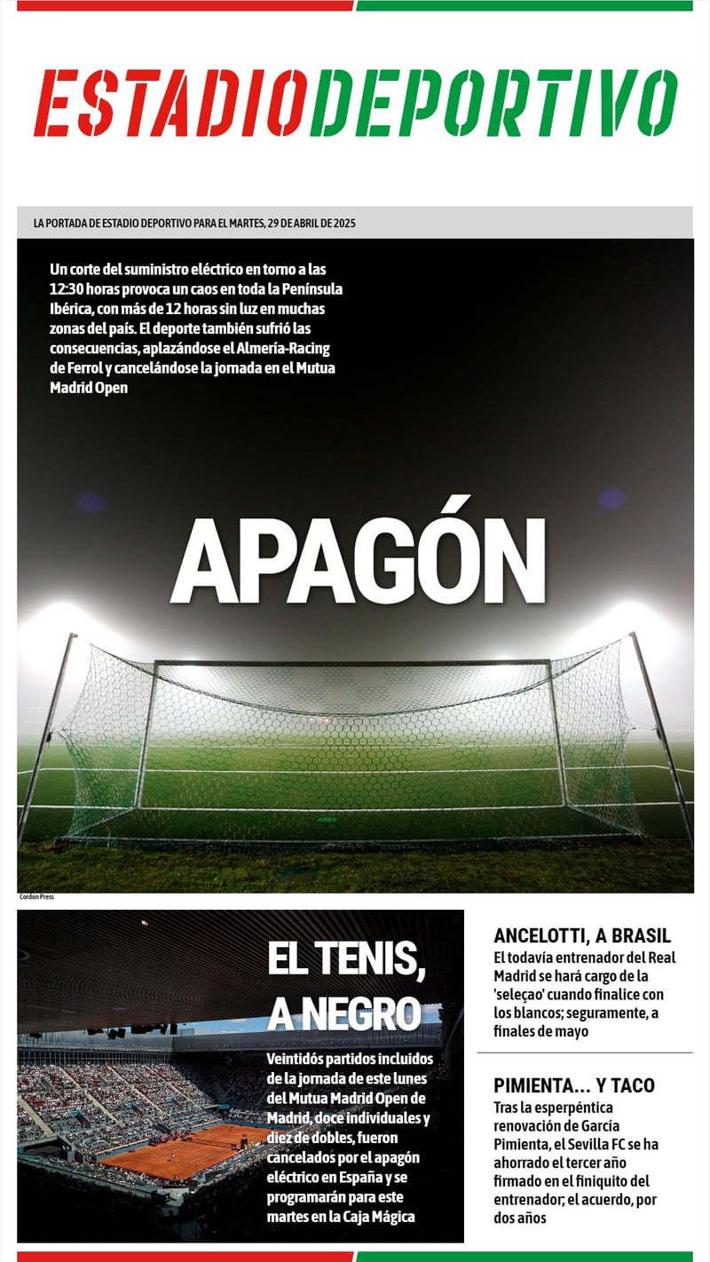 El gran apagón eléctrico sufrido por España este lunes, protagonista absoluto de la portada de ESTADIO Deportivo