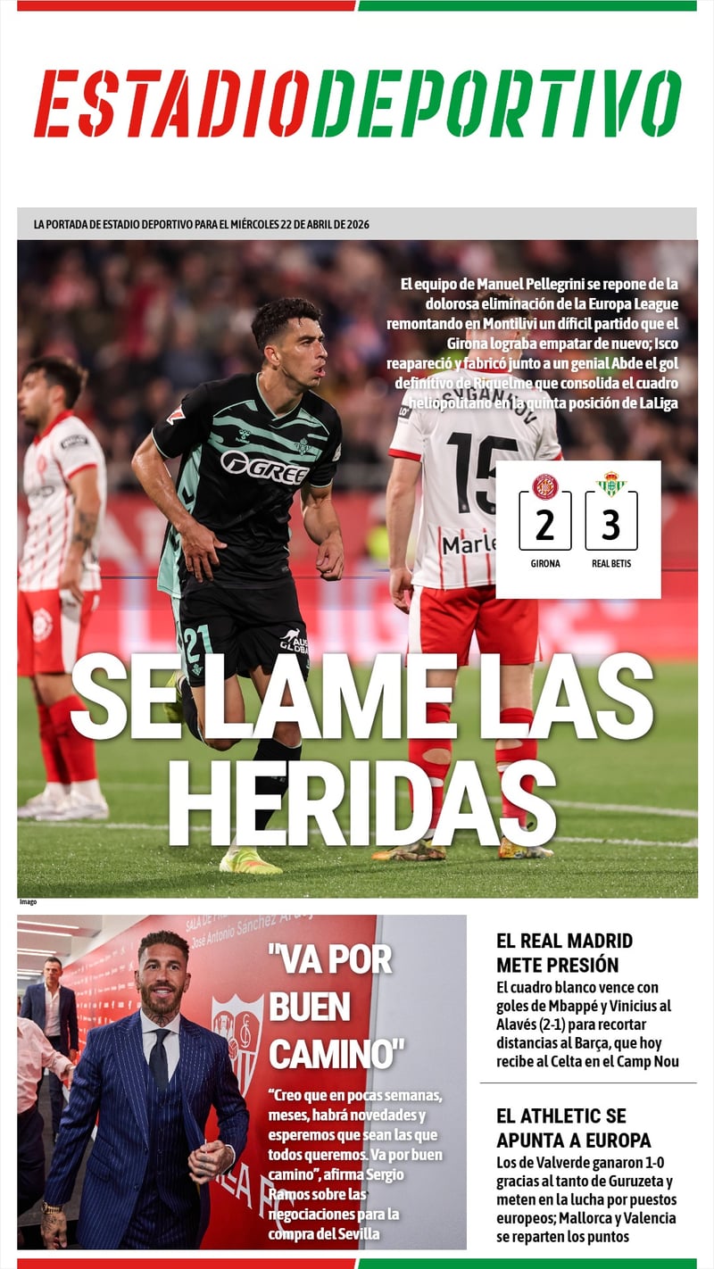 La portada de ESTADIO Deportivo para el miércoles 22 de abril de 2026:
