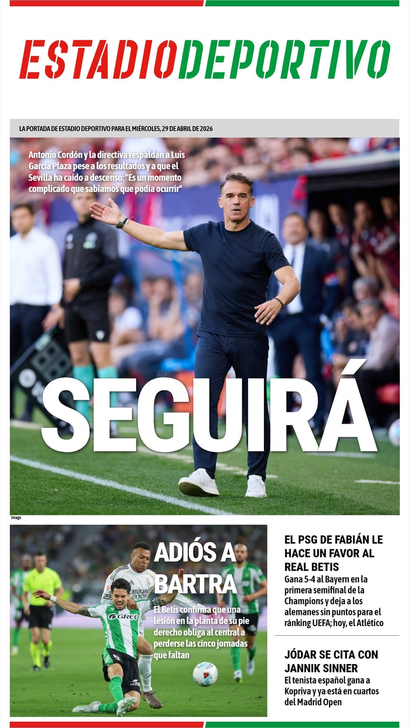 La portada de ESTADIO Deportivo para el miércoles 29 de abril de 2026