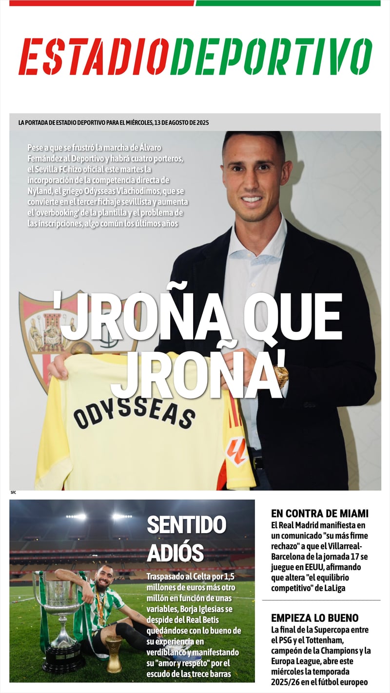 El fichaje de Vlachodimos por el Sevilla FC, la marcha de Borja Iglesias del Betis, la protesta del Real Madrid por la marcha de un partido de LaLiga a EEUU y la previa de la Supercopa de Europa, protagonistas de la portada de ESTADIO Deportivo