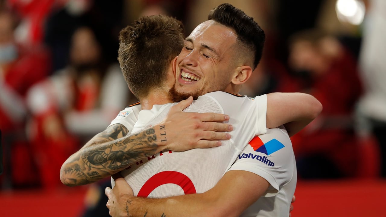 Ocampos se abraza con Rakitic tras anotar un gol la pasada campaña.UES