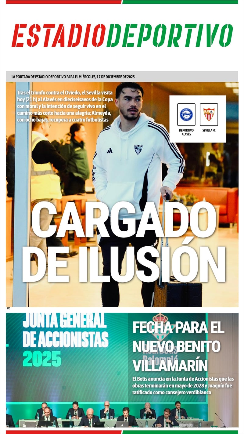 El partido de dieciseisavos de Copa del Rey que enfrenta al Sevilla con el Alavés y la Junta de Accionistas del Betis, protagonistas de la portada de ESTADIO Deportivo de este miércoles 17 de diciembre