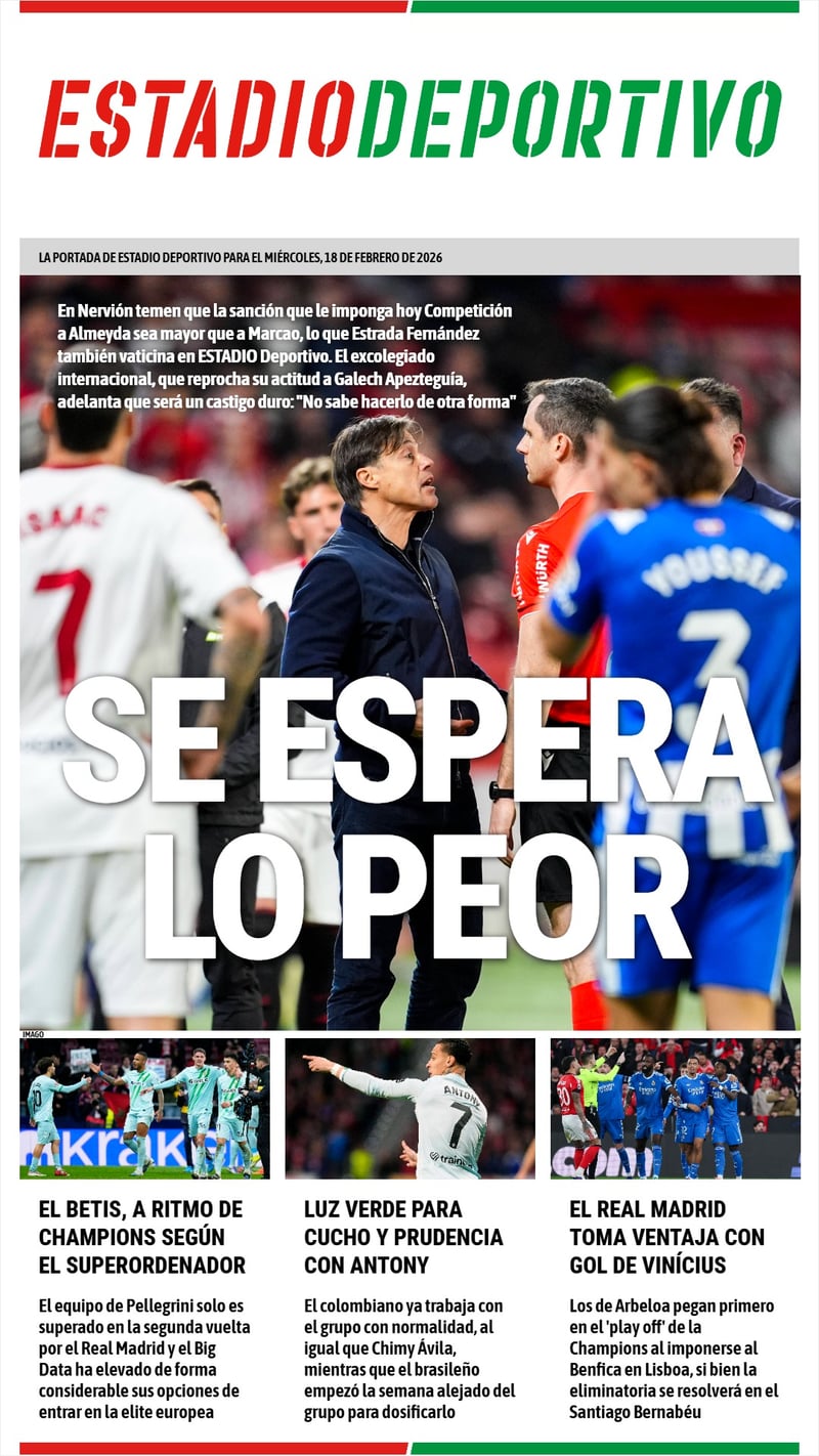 La portada de ESTADIO Deportivo para este miércoles se centra en la sanción al Almeyda y la estimación del excolegiado Estrada Fernández; también hay cabida para la aceleración y la actualidad del Betis, y el triunfo del Real Madrid