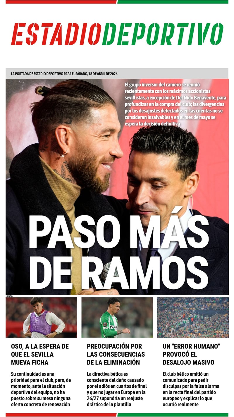 ESTADIO Deportivo abre su portada de este sábado con la reunión para avanzar la compra del Sevilla por parte del grupo inversor liderado por el camero; además, hay espacio para la renovación de Oso, la preocupación en el Betis y la causa del desalojo de La Cartuja