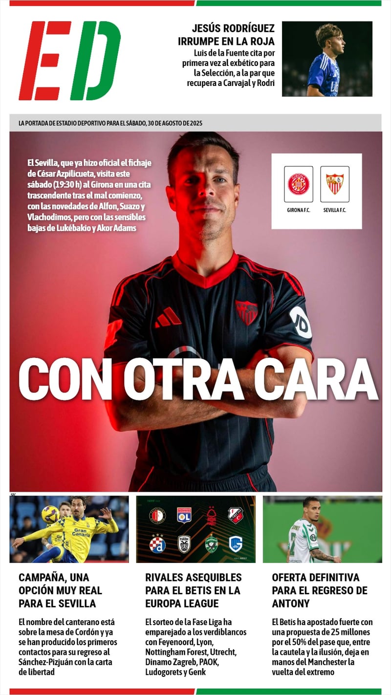 La visita nervionense al Girona con caras nuevas tras oficializar el fichaje de Azpilicueta abre la portada de ESTADIO, con otros protagonistas como Jesús Rodríguez, Campaña, el sorteo de la Europa League y Antony