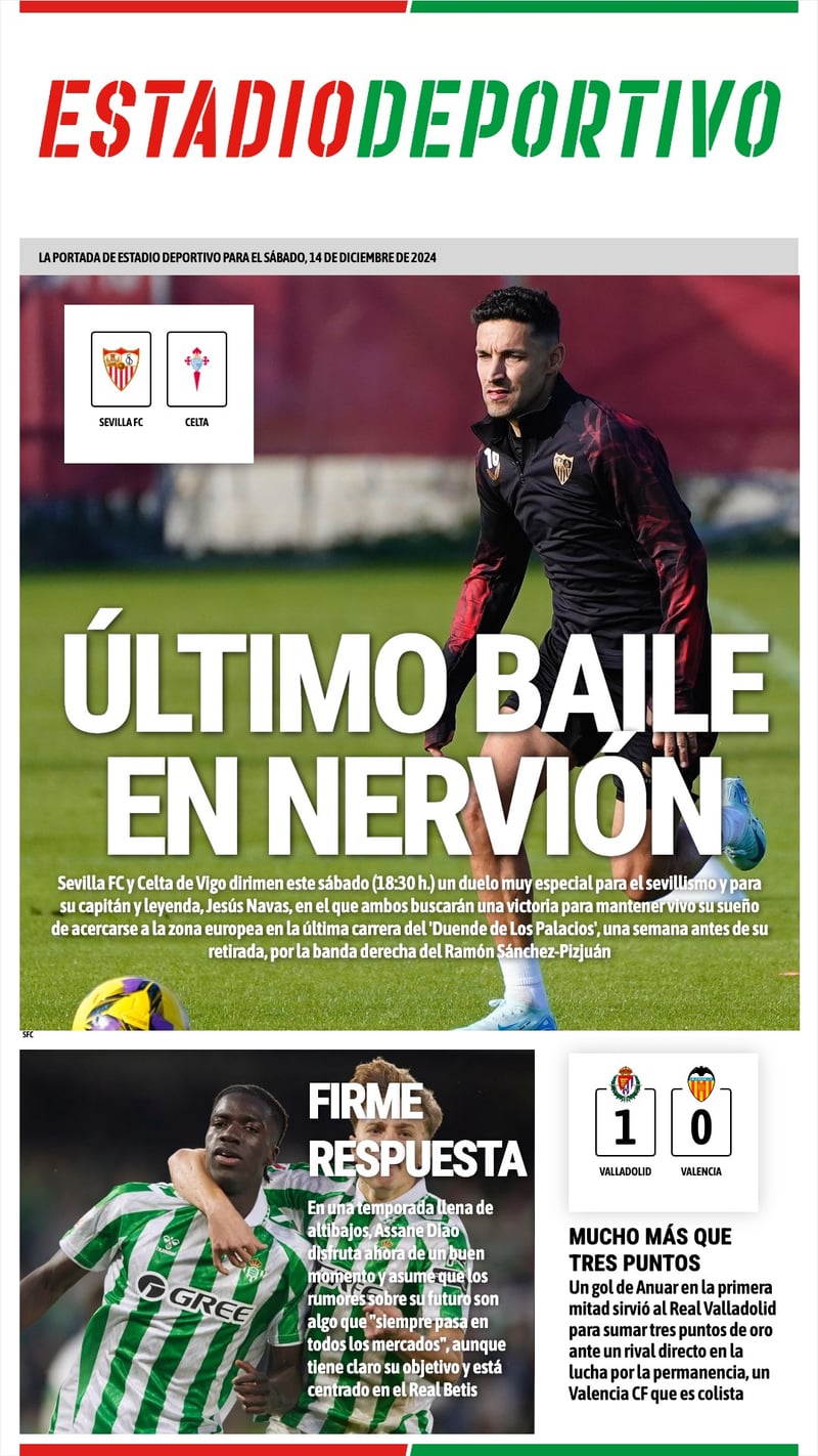 La previa del partido entre el Sevilla y el Celta, el último de Navas en el Sánchez-Pizjuán, la respuesta de Assane Diao a los rumores y el triunfo del Valladolid ante el Valencia, protagonistas de la portada de ESTADIO Deportivo