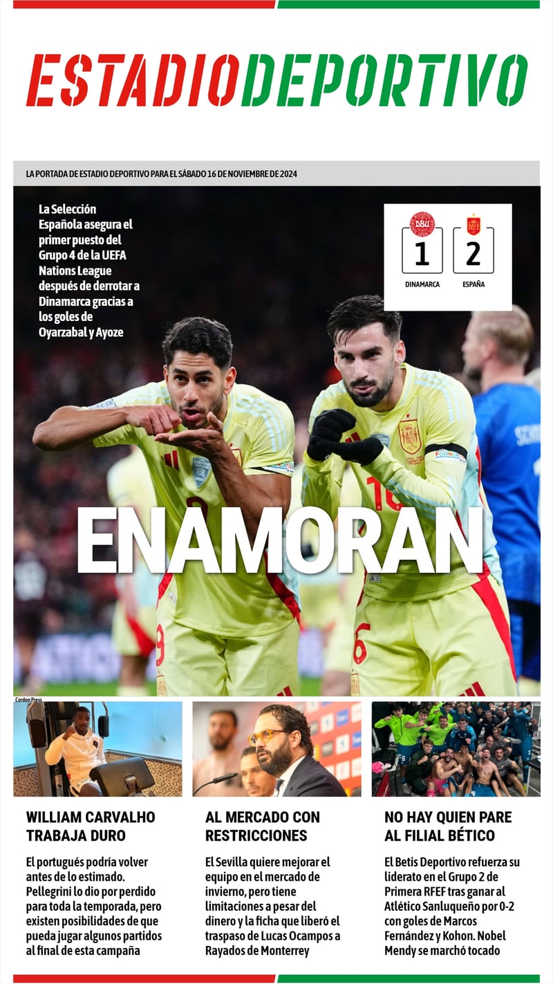 La victoria de España contra Dinamarca en la UEFA Nations League, un nuevo triunfo del Betis Deportivo, las dificultades del Sevilla de cara al mercado de invierno y la evolución física de William Carvalho, lo más destacado