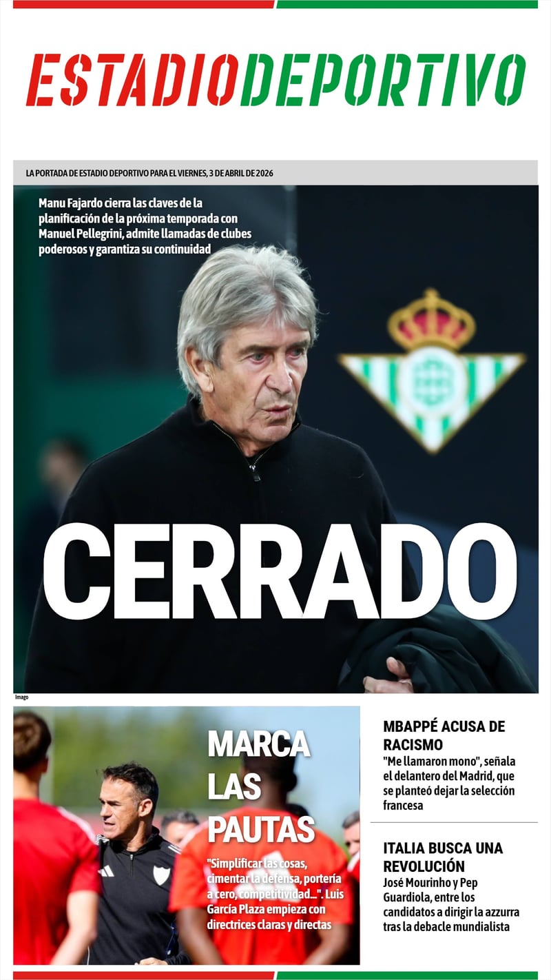 La portada de ESTADIO Deportivo para el viernes, 3 de abril de 2026