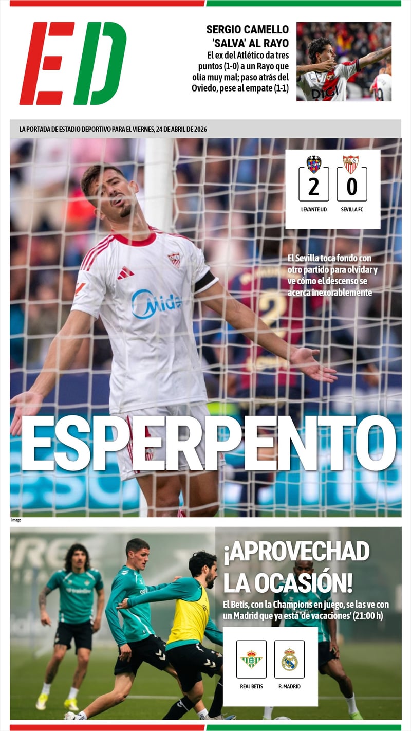 La portada de ESTADIO Deportivo para el viernes 24 de abril de 2026