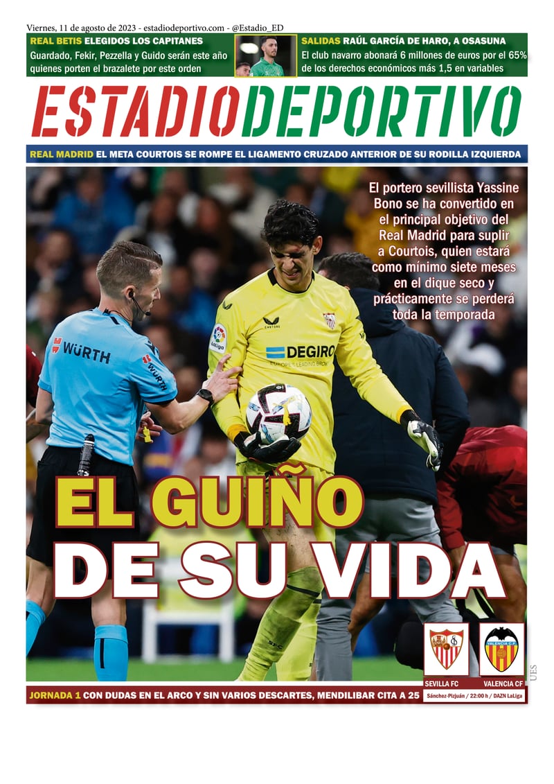 La lesión de Courtois en el Real Madrid ha provocado que Yassine Bono vuelva a estar en la rampa de salida del Sánchez-Pizjuán. El marroquí es el favorito de Ancelotti y de los dirigentes blancos para sustituir al cancerbero belga. Hoy arranca LaLiga con el Almería-Rayo y un Sevilla-Valencia