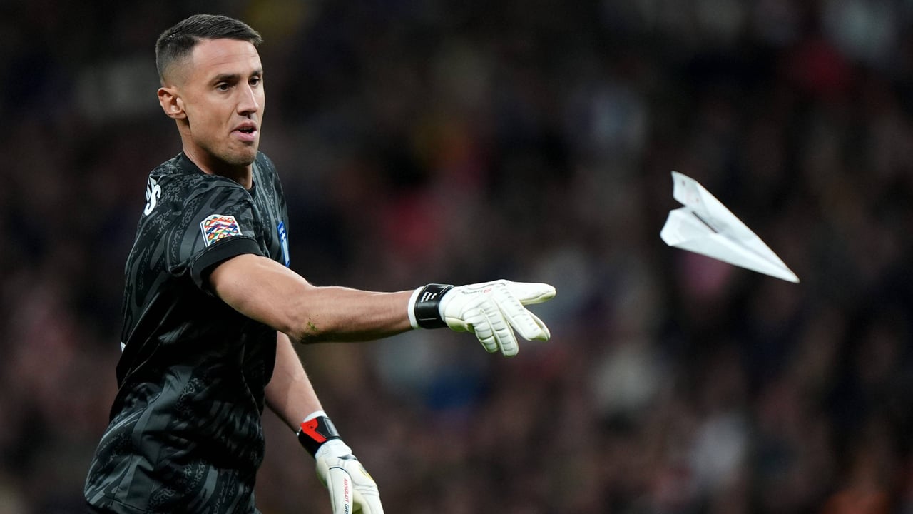El que será nuevo guardameta blanquirrojo lanza un avión de papel con la selección griega.CORDON PRESS