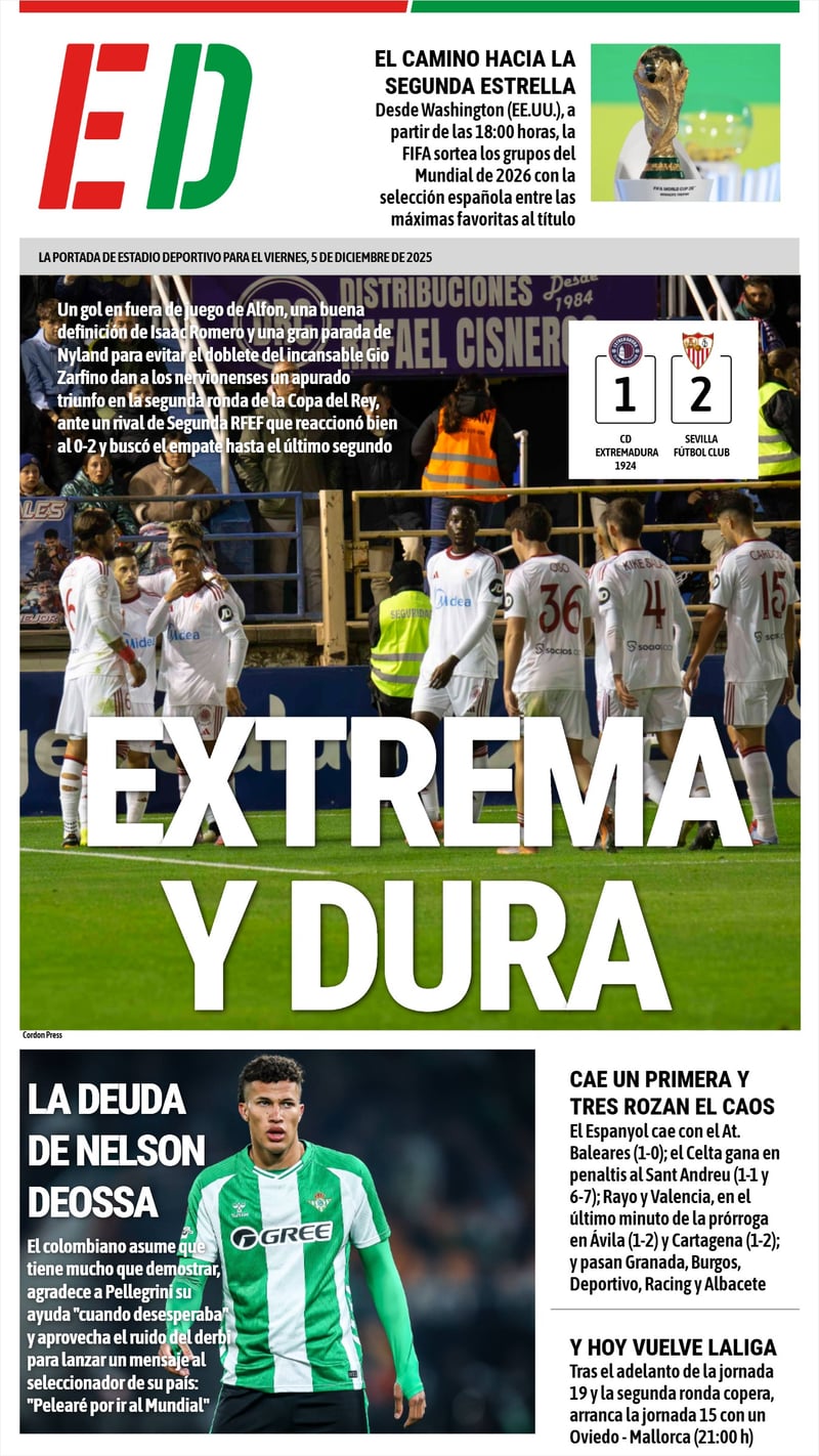 La portada de ESTADIO Deportivo para este viernes, día 5 de diciembre de 2025, llega marcada por la apurada victoria del Sevilla FC ante el CD Extremadura en la tercera y última tanda de partidos de la segunda ronda de la Copa del Rey, que también dejó en la noche de este jueves un sonado batacazo del RCD Espanyol y agónicas victorias del RC Celta de Vigo, del Valencia CF y del Rayo Vallecano. Las sinceras confesiones de Nelson Deossa o las molestias de Antony dos Santos son noticia en el Real Betis y el gran evento del día es el sorteo de la Fase de Grupos del Mundial 2026 que se celebra esta tarde en Estados Unidos.