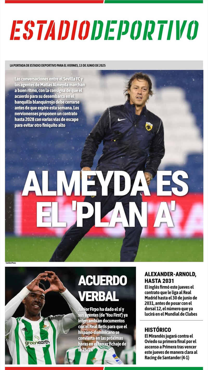 El banquillo del Sevilla, el acuerdo entre Junior y el Betis, la victoria del Mirandés y la presentación de Alexander-Arnold, protagonistas de la portada de ESTADIO Deportivo