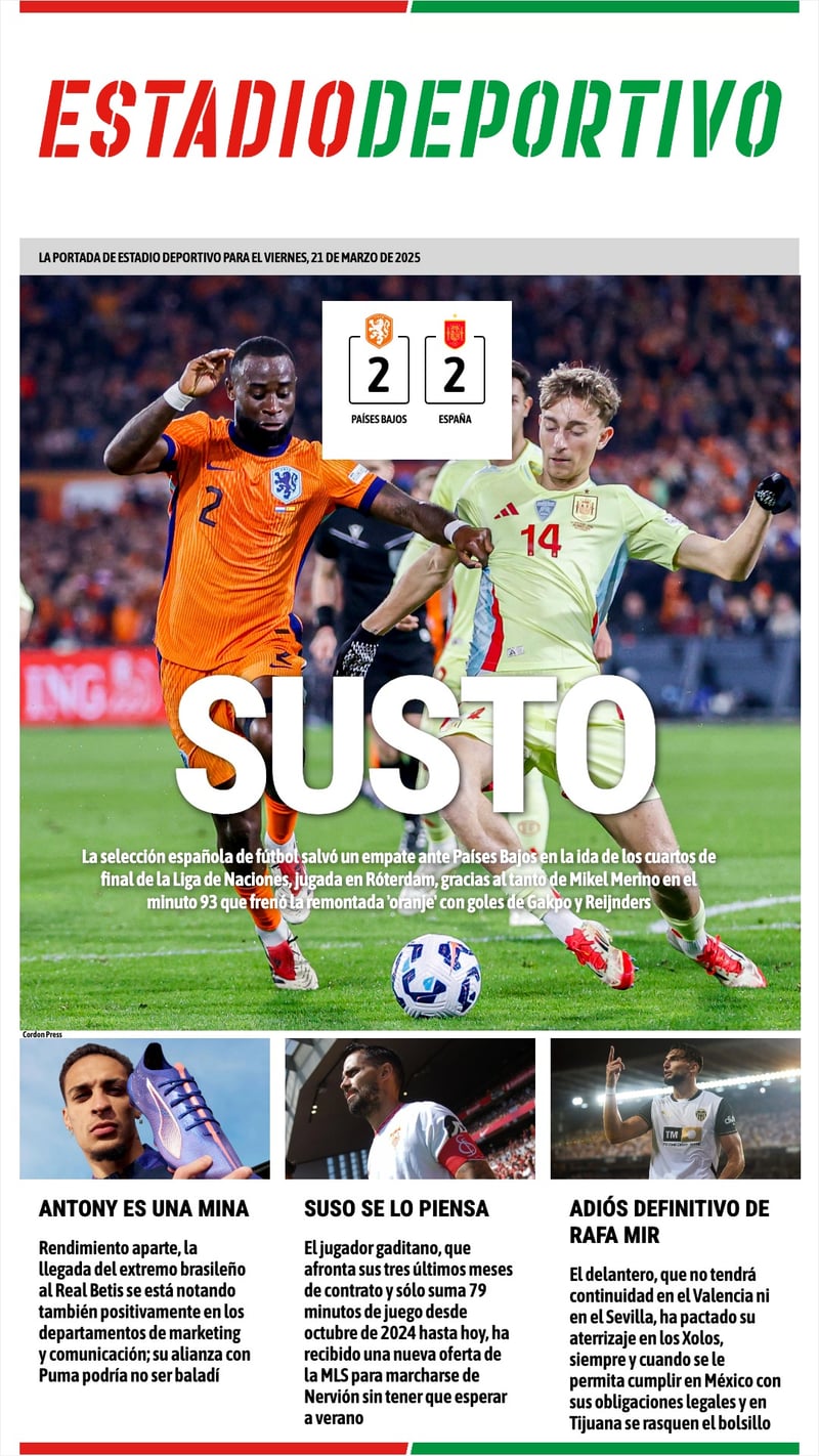 El empate de la selección española ante Países Bajos, el adiós de Rafa Mir, Suso y Antony, protagonistas de la portada de ESTADIO Deportivo