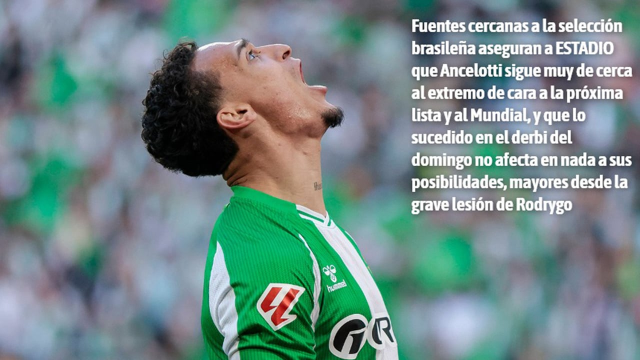 Fuentes cercanas a la selección brasileña aseguran a ESTADIO que Ancelotti sigue muy de cerca a Antony de cara a la próxima lista y al Mundial, y que lo sucedido en el derbi del domingo no afecta en nada a sus posibilidades, mayores desde la grave lesión de Rodrygo