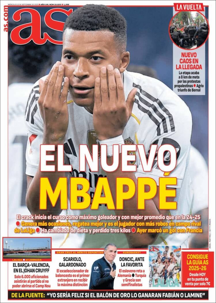 En las portadas madrileñas se hace mención principalmente a Mbappé y su buen inicio de temporada, tanto con el Real Madrid como ahora en el parón de selecciones con el combinado francés. También es tema destacado las protestas que están teniendo lugar en La Vuelta y una entrevista a Vingegaard en la que habla sobre el temor que están teniendo los ciclistas. Por su parte, también se tocan otros temas como las claves del fichaje de Nico González por el Atlético de Madrid, el récord conseguido por Cristiano Ronaldo y el Eurobasket.