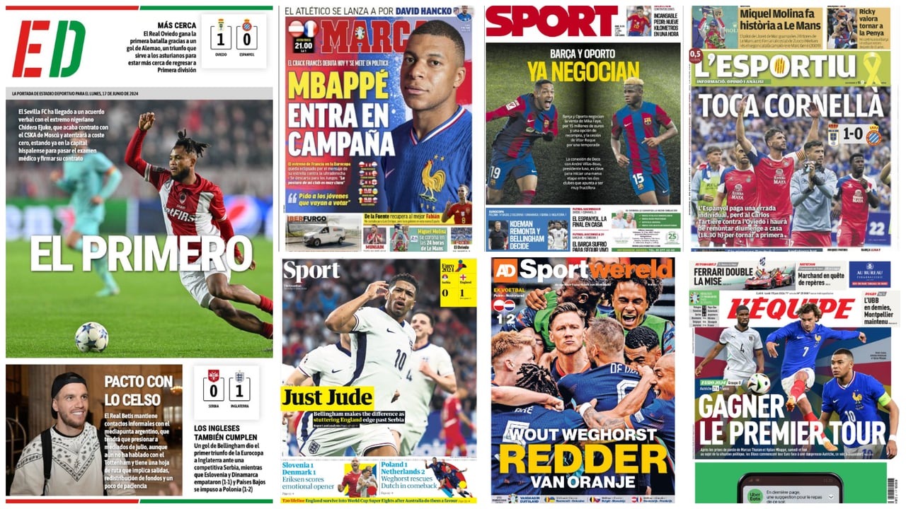 El repaso de prensa a las portadas de los principales periódicos deportivos en este lunes, día 17 de junio de 2024 llega con protagonismo para nombres propios como los de Jude Bellingham, héroe del primer triunfo de Inglaterra en la Eurocopa 2024, o el de Kylian Mbappé, quien además de estrenarse hoy con Francia en el torneo ha dejado muchos titulares por posicionarse políticamente en contra del auge de la extremaderecha en su país. No obstante, hay mucha información más al margen del torneo continental, pues el Sevilla FC ya ha cerrado su primer fichaje; el Real Betis prepara el terreno para un reencuentro con el argentino Giovani Lo Celso, concentrado con su selección para la Copa América; y el FC Barcelona negocia con el FC Oporto portugués la salida de dos futbolistas culés que no entran en los planes de Hansi Flick.