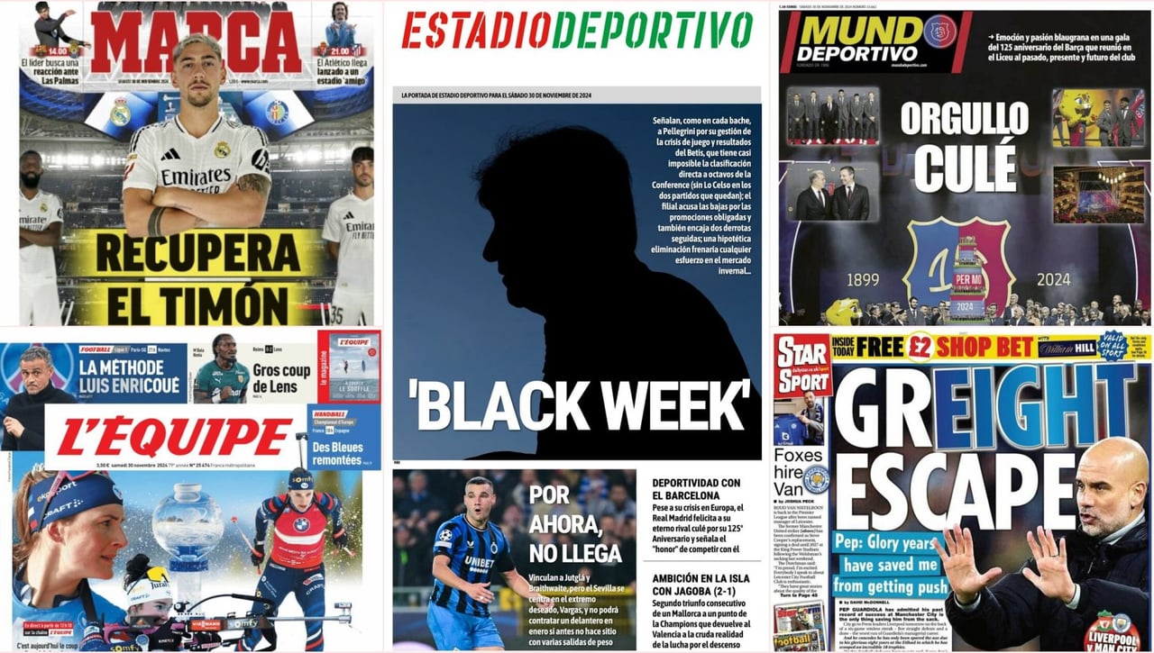 Jornada de contrastes la de este sábado 30 de noviembre respecto a las portadas deportivas. Por un lado nos encontramos a un Real Betis que está viendo como el barco empieza a dirigirse a la deriva. El desastre en Conference League y las múltiples consecuencias negativas del mismo entran en escena. También hay preocupación en el Real Madrid, pero verse tan 'elogiados' en los premios The Best parece haber calmado las aguas mientras se espera el 'regreso' de Kylian Mbappé. Ya en el panorama internacional, sigue destacando el seguimiento diario que están haciendo en Inglaterra a un Pep Guardiola que acumula seis partidos consecutivos sin ganar con el Manchester City (cinco de ellos han sido derrotas).