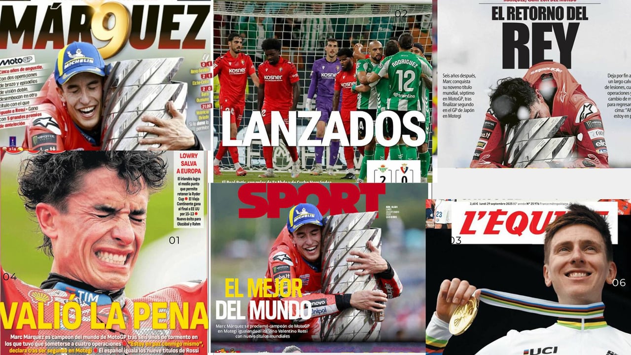 Las portadas de las principales cabeceras deportivas nacionales coinciden en su mayoría este lunes 29 de septiembre de 2025 en destacar la proeza histórica de Marc Márquez, que ayer conquistó su noveno título mundial de motociclismo, el séptimo en MotoGP, e iguala a una leyenda como Valentino Rossi.